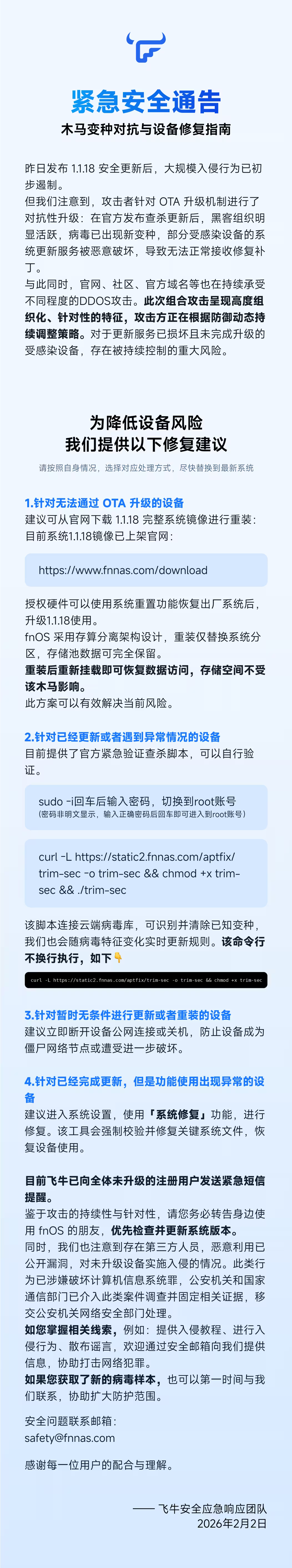 以下为飞牛官方修复方案: